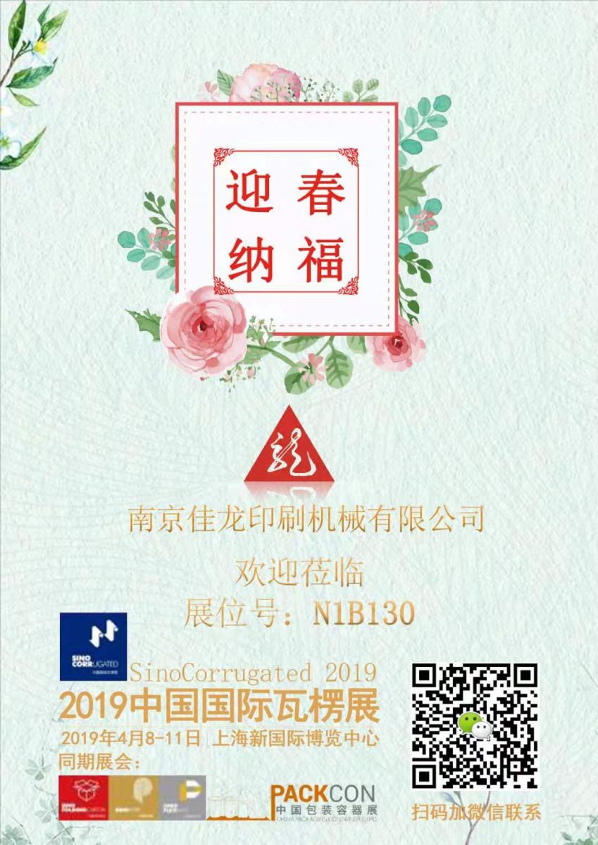 2019中國國際瓦楞展!南京佳龍印刷機(jī)械有限公司攜最新全自動(dòng)翻轉(zhuǎn)機(jī)參展,展位號N1B130。歡迎各位新老顧客蒞臨指導(dǎo)!